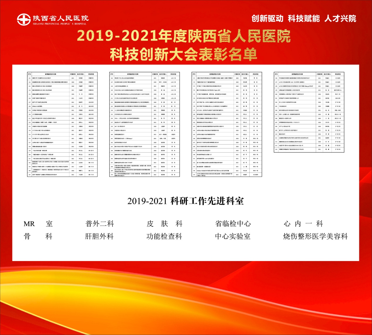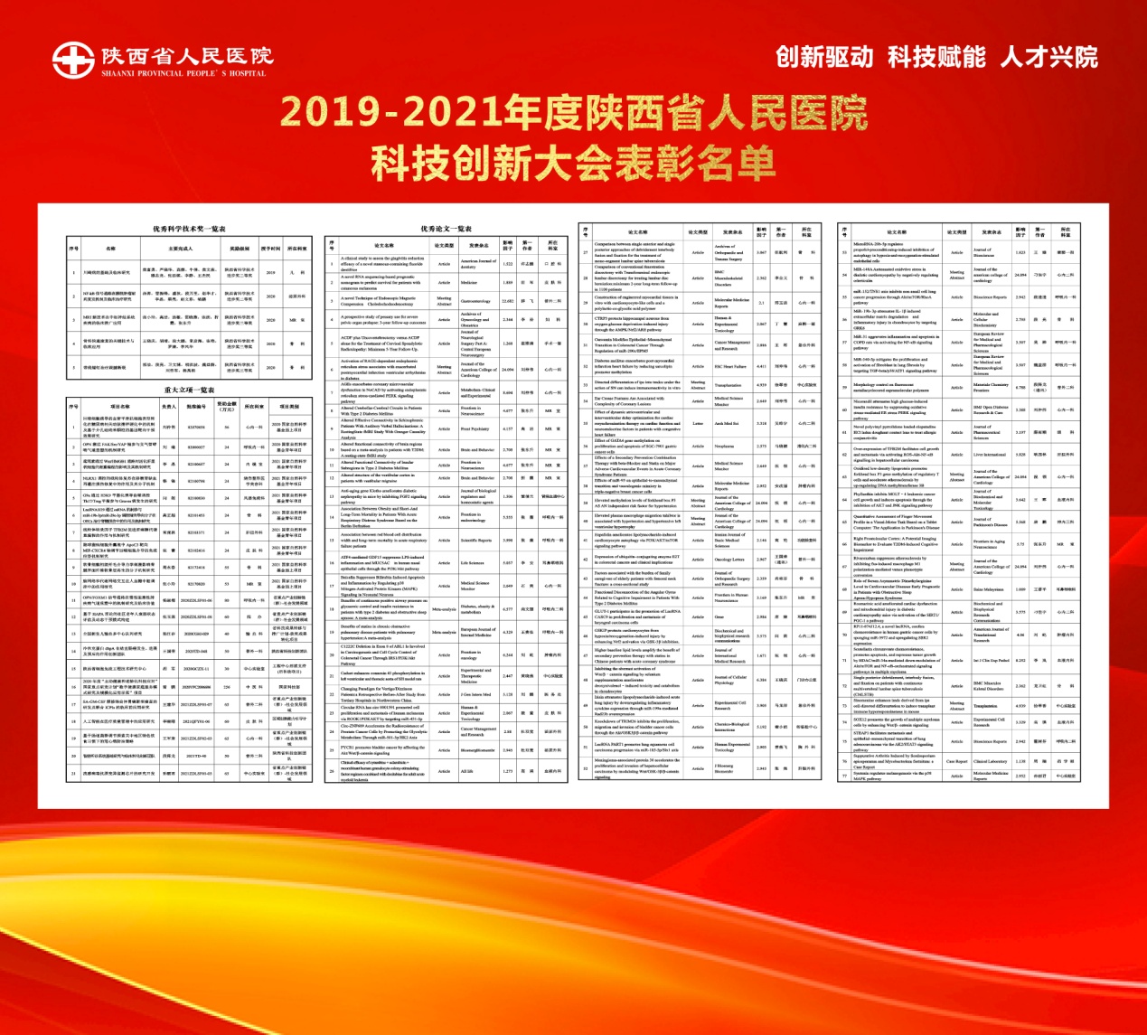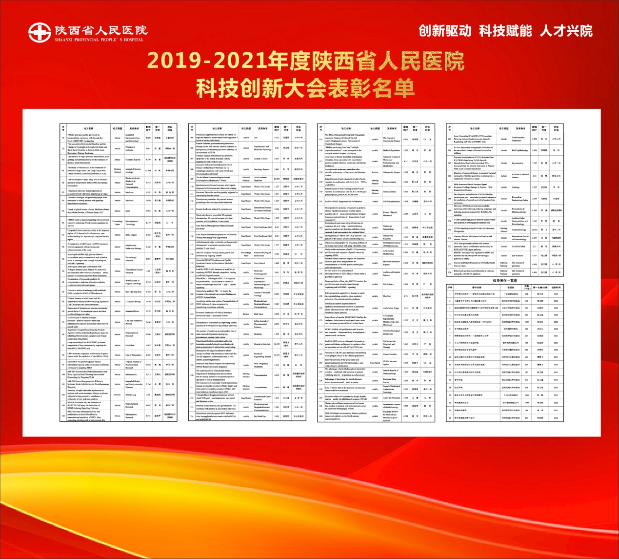 获得国家级和省级重大项目21项,2021年国家自然科学基金项目获资助8项,创历史新高;其他各级各类项目405项,获资助经费4975万元;发表论文1500篇,其中SCI源期刊论文176篇;获得发明专利24项,出版专著18部、指南共识25篇;开展首例新技术、新业务214项,新增陕西省科技创新团队2个,青年科技新星2名;各级各类学会主任委员66人次;科学技术二等奖2项、三等奖3项;新增临床医学研究中心2个;引智基地、国际合作基地、中西医结合示范基地、真实世界研究分中心落户21点技巧中心