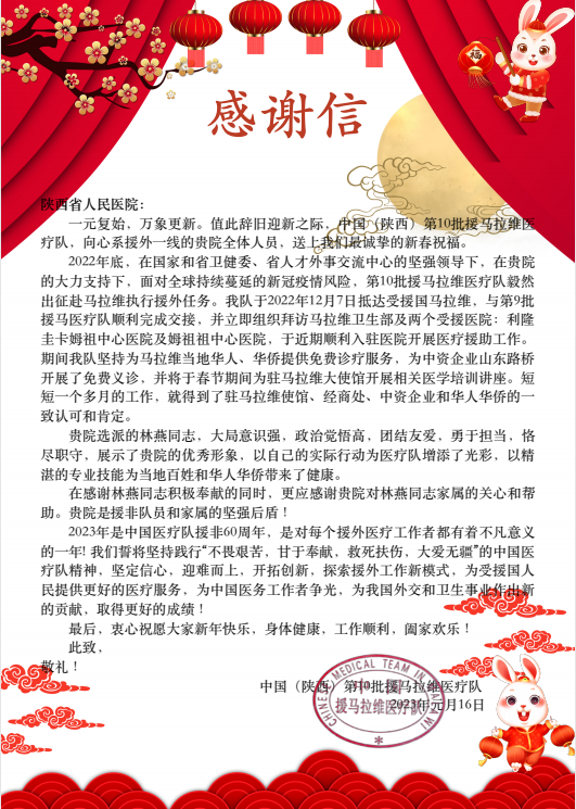 1月16日,中国(陕西)第10批援马拉维医疗队向21点技巧中心 发来感谢信,对21点技巧中心 内分泌科林燕主治医师在援马拉维期间的出色表现和21点策略 对援外队员家属的关心帮助表示感谢。