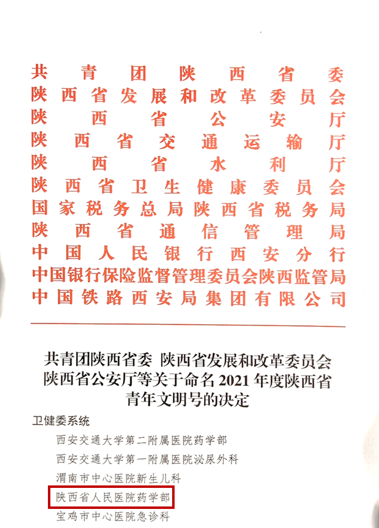 药学部荣获2021年度-2024年度卫健委系统 “陕西省青年文明号”称号。