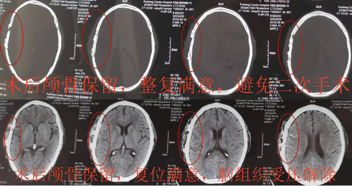 训给了刘晓斌坚定的信念,经过近2小时认真仔细的操作,原本支离破碎的颅骨被完全整复,患者自体颅骨不仅得到保留,同时避免了二次颅骨修补手术的风险,也极大地节省了医疗费用。手术取得圆满成功,术后患者很快清醒,伤口愈合良好,神经功能恢复顺利,复查头颅CT显示颅骨整复塑型良好。