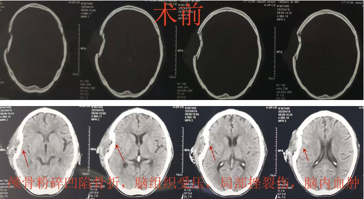 的神经外科专家刘晓斌副主任医师,第一时间赶到患者身边进行查看,制订急救方案:患者头皮多处裂伤、颅骨粉碎凹陷骨折,脑组织受压合并挫裂伤等,需要急诊手术解除脑组织压迫,同时考虑到患者高龄,如果去除颅骨,不仅影响后续生活质量,而且二次手术增加创伤风险,并且增加经济负担。刘晓斌副主任医师再三思考,决定行“开颅血肿清除+颅骨粉碎凹陷骨折整复术”。