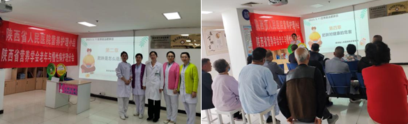 三、进行全民营养周热身,在内分泌糖尿病病院,营养护理小组、临床营养科联合开展5.11世界肥胖防治日患教会,主题为“远离肥胖,关爱健康”。李宇菲等营养护士为患者及家属授课、答疑解惑。