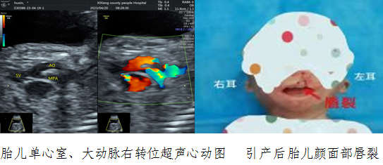 病例四,30岁,孕19+W,G2P1,产前唐筛检查结果低风险,来院行产前超声检查。贾玄慧医生通过检查,超声诊断:胎儿先天性心脏病、完全型大动脉转位、室间隔缺损;颅面部声像图所见考虑全前脑、喙鼻;双肾声像图所见考虑多囊肾。告知孕妇胎儿存在多发畸形,且预后差。孕妇于多家复查结果一致,终止妊娠,产后见胎儿并存双手六指畸形等。