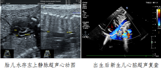 对口帮扶贾玄慧医生,超声发现胎儿存在先天大血管发育异常——永存左上腔静脉,指导孕妇进行产前咨询及产后随访。胎儿出生后1天,贾玄慧医生立即对该新生儿进行了心脏复查,结果确诊永存左上腔静脉诊断明确。