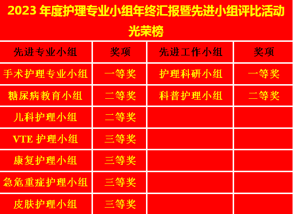 最后,刘晓梅副主任做了简短总结,充分肯定和表扬了各小组开展的工作,对不足之处进行了指导并宣读了评比结果,手术护理小组、护理科研小组分别荣获先进专业小组和先进工作小组一等奖。