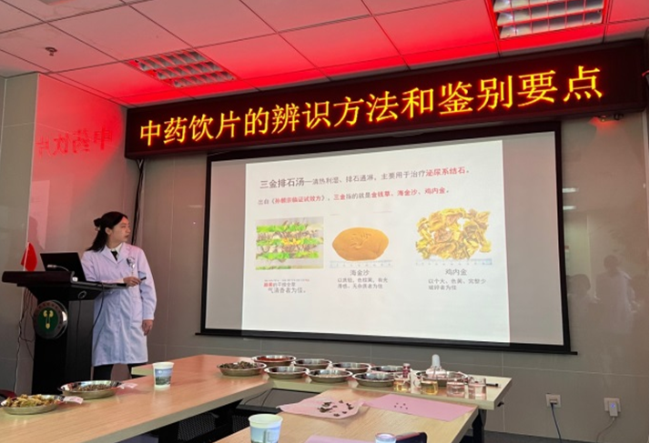 中医科李娟娥副主任详细介绍了泌尿系统常见病的中医治疗方法,从反复尿路感染、泌尿结石、膀胱过度活动症、肿瘤患者的焦虑失眠、中药毒性作用等五个方面分别进行了阐述。药学部高原雪中药师对泌尿外科常用中药饮片的辨识方法和鉴别要点进行分享,通过现场药材辨识,水试、火试的演示,参会医护人员对这十几种中药饮片有了更深入的了解。
