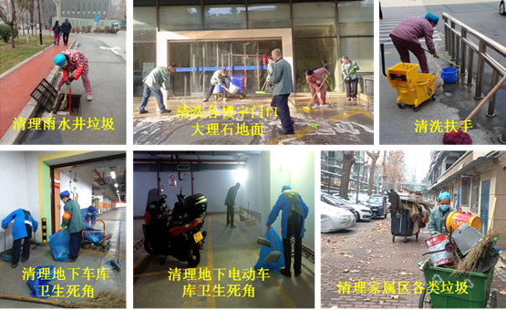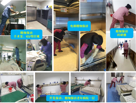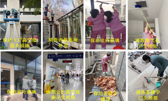 一是清理室内外高空卫生死角。清洗新大楼及门诊楼一层大厅高空墙面及设施,保洁各楼宇室内换气口、玻璃、门帘、门头,清理室外楼顶落叶,清洗西院餐厅玻璃连廊外顶和门诊楼及新大楼车库东西入口通道外顶,彻底清除高空卫生死角。二是清理大环境卫生死角。清洗各楼宇门口大理石地面、扶手及门帘、清理室外道路雨水入口垃圾、家属区建筑装修垃圾及卫生死角、门诊地下一层自行车电动车存放点、新大楼负二层车库杂物垃圾等,保持大环境干净整洁。三是精细化保洁重点区域。精细化保洁电梯轿厢内外、ICU及手术室各类设备、公区室内地面设施以及科研楼全部区域,对老年病院一层病区装修后进行开荒保洁及精细保洁,保证重点区域卫生质量达标。