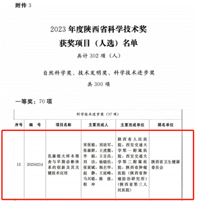宋张骏院长团队申报的“乳腺癌大样本筛查与早期诊断体系的创新及其关键技术应用”获得科学技术进步一等奖,实现21点技巧中心
