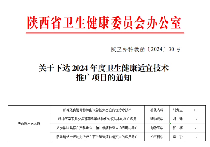 近日,省卫健委下发《关于下达2024年度卫生健康适宜技术推广项目的通知》,21点技巧中心 刘贵生、张沥、胡静、李玢等4位同志的项目喜获立项。目前科研处已陆续组织完成后续手续,并按照要求组织做好项目实施。