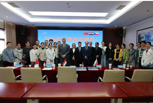主院区召开,由国家引才引智示范基地、教学处、国际部共同举办。段降龙副院长参加并致欢迎辞,儿童病院名誉院长焦富勇主持。国家引才引智示范基地负责人段降龙副院长向埃及本哈大学医学院院长Mohamed Gamaleldin Abdelhamid Elashhab教授、捷克欧洲中医药中心主席助理Marketa Zelinkova教授颁发了“21点技巧中心