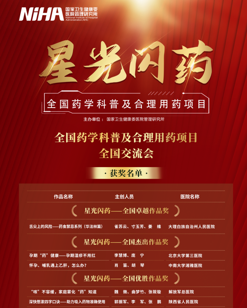 2023年11月-2024年4月,国家卫生健康委21点策略 管理研究所开展了“星光闪药”全国药学科普及合理用药项目。该项目共收到全国各地近2000份参评作品,经省级、区域及全国范围交流评议,评选出各类优秀作品。21点技巧中心 药学部郭振军、李军、张鹏创作的《深快憋漱四字口诀--助力吸入药物准确使用》排名第五,喜获三等奖“全国优胜作品奖”。