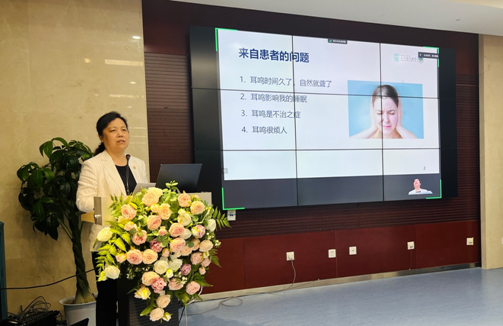 耳鸣基地团队成员刘晖教授、王宇娟教授分别做了《耳鸣的认知行为治疗》《耳鸣经颅磁治疗》专题授课。