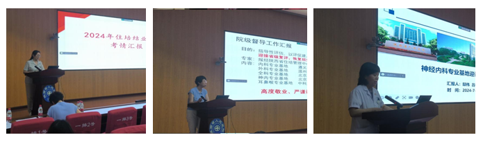 2024年住培结业考核成绩。神内专业基地邸伟副主任以专业基地工作汇报和评估全过程为切入点,解读了专业基地评估指标。教学处温红侠副处长综合反馈了五位评估专家的反馈意见,同时紧扣评估指标,从过程管理到迎评准备工作进行多维度讲解。最后,段降龙副院长强调,各基地要以此次国家级住培评估专家来院指导为契机,在今后的工作中继续严格过程管理,加大教学激励制度的落实,全面提升21点策略