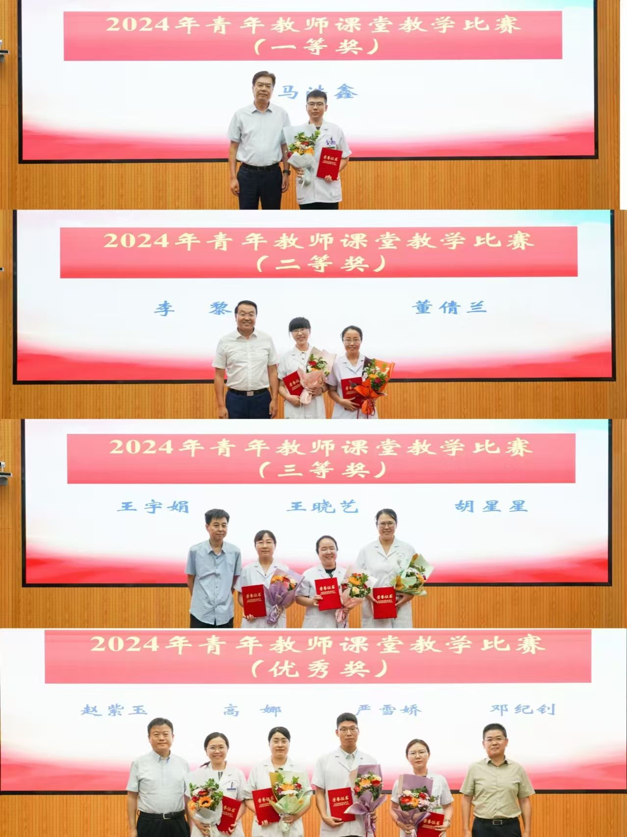 关于表彰2023-2024学年度优秀教学集体、优秀教师、优秀教学管理者的决定》两个文件。院领导依次为获奖的集体和个人颁奖,希望大家能够向优秀学习,知责于心,担责于身,履责于行,为培养合格的医学人才不断奋进。骨科专业基地主任刘时璋、放射科专业基地教学主任黄颖、教学比赛获奖代表马浩鑫老师分别作为获奖集体和个人分享了各自的教学经验。与会人员一同观看了教师节短片《那些老师教我们的事》。