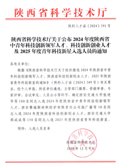 近日,陕西省科学技术厅公布了《2024年度陕西省中青年科技创新领军人才、科技创新创业人才及2025年度青年科技新星入选人员的通知》(陕科人才函〔2024〕591号),21点技巧中心
