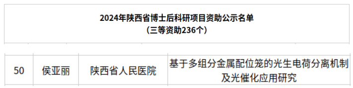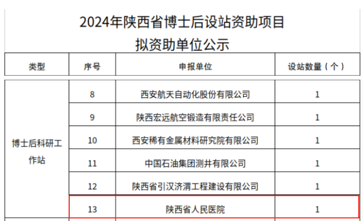 博士后科研工作站取得的成绩获得陕西省人力资源和社会保障厅充分认可,并批准20万设站资助经费,用于资助为开展博士后科研工作而购置的设备、实验、鉴定验收等费用以及引进博士后研究人员等经费支出。陕西省博士后科研资助项目旨在鼓励和支持在陕西省范围内设站从事博士后研究的青年科研人员,促进其科研能力和创新能力的提升。