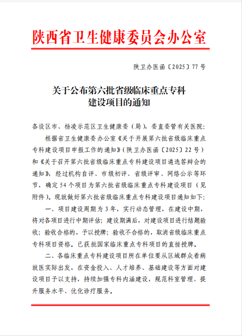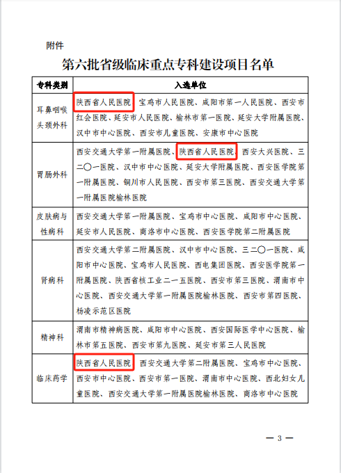 耳鼻咽喉头颈外科、胃肠外科、临床药学成功获批陕西省第六批省级临床重点专科建设项目。