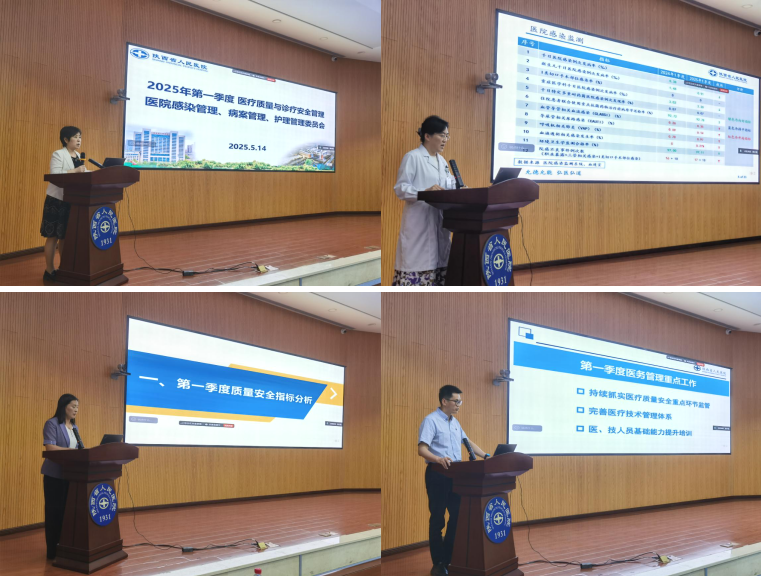 组织召开2025年第一季度医疗质量与诊疗安全管理、院感管理、病案管理、护理管理委员会扩大会议,全面分析医疗质量管理情况并部署下阶段重点工作。王建华副院长、四个委员会委员共100余人参会,医务处张小玲处长主持会议。