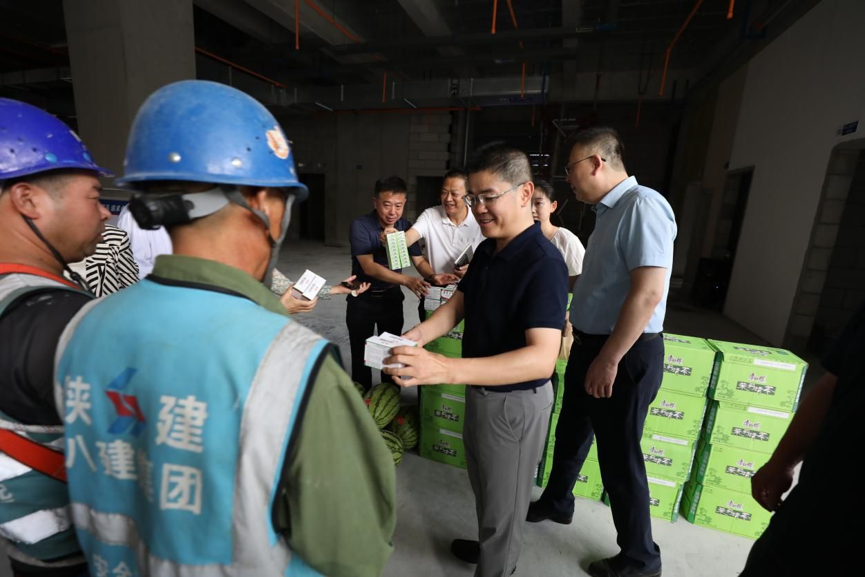在A栋住院楼建设工地,党委书记张玉莲特别强调,要严格落实高温作业安全防护措施,确保施工安全;同时要求大家在保证身体健康的前提下,科学组织、合理安排施工,确保项目建设任务安全、保质、如期完成。