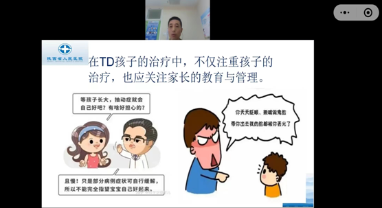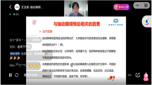 郭向阳主任医师、王洁英主治医师、李宏艳主治医生以及樊莹丽主管护师讲解了抽动障碍的诊断、治疗、预防以及家庭管理、心理护理等方面内容。郭向阳主任医师进行了现场答疑,对家长们提出的具体问题给予专业的解答和建议,同时对抽动障碍的共患病进行深入浅出的讲解。近千名人员线上参与,气氛十分热烈,家长及患儿进一步认识到抽动障碍治疗的必要性及规范性,了解到家庭和周围人的关爱关注对孩子的康复有着至关重要的影响,增强了战胜疾病的信心。讲座在大家的感谢声中结束。