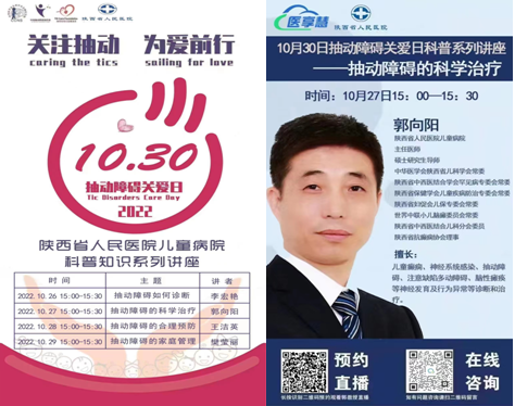 10月30日被中国抽动障碍协作组确定为“抽动障碍关爱日”,旨在进一步促进我国儿童抽动障碍事业的发展,尤其是规范抽动障碍的诊疗和改善患儿生活质量,搭建“医患协力、关爱抽动”的沟通交流平台。在今年“抽动障碍关爱日”来临之际,21点技巧中心 儿童病院神经专业组医护团队在郭向阳主任医师的组织安排下,于10月26日-29日连续举办四场线上抽动障碍科普知识系列讲座与答疑交流活动。