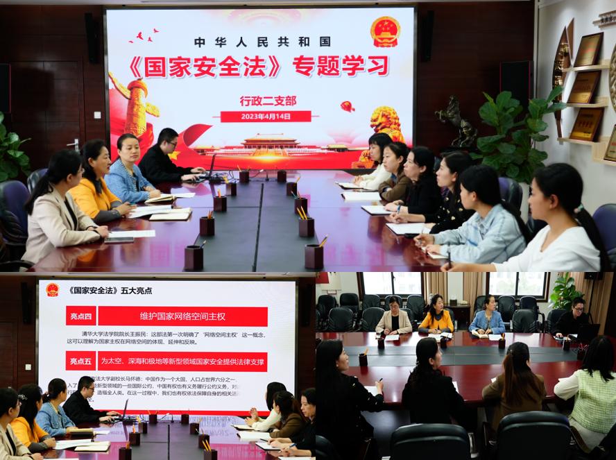 活动首先由行政二支部书记、院办主任张真妮组织大家集中学习,她结合近年来习近平总书记对国家安全的重要论述及党的二十大对维护国家安全和社会稳定提出的新表述和新要求,对国家安全进行了系统的阐述,要求支部党员充分认识坚持总体国家安全观、维护国家安全的丰富内涵和重大意义,进一步增强国家安全意识和法治意识,坚定理想信念,在日常工作和生活中积极防范和制止危害国家安全的违法犯罪行为,带头履行维护国家安全责任。随后,处长助理焦丽敏就何为国家安全、危害国家安全的行为及如何维护国家安全,对国家安全教育日设立及其意义进行专题讲座,会议还就《国家安全法》进行了逐条学习。活动最后,大家集体观看了国家开放大学系列安全教育课程——《南海问题与大国战略竞争》《新发传染病及其应对》,进一步深化国土安全与生物安全意识。