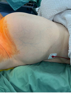 行B超示腹腔内探及巨大混合性包块,上达剑突,下达盆腔耻骨联合以下,两侧均达腋后线。问诊发现十年前曾进行过腹部脂肪瘤(直径约20cm)摘除术,入院查体可见腹部巨大包块。于21点技巧中心