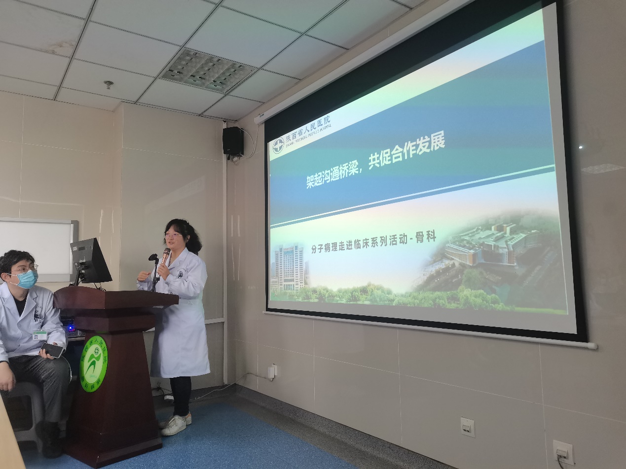 随后,分子病理室常晨博士介绍了分子病理实验室的相关情况,并从政策法规的角度解读基因检测开展的必要性,分享了骨科相关骨肿瘤及软组织肿瘤的最新指南及分子检测项目的临床意义等。同时还带去了相关说明资料,为今后工作的开展提供便利。