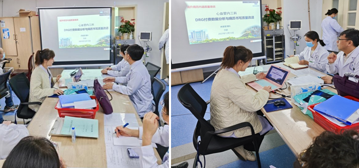 病案室苏晓东主任及吕歆医师到科室召开DRG数据分析与病历书写质量改进会,心内三科姜馨副主任主持,全体医护人员参加。