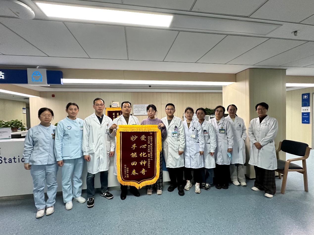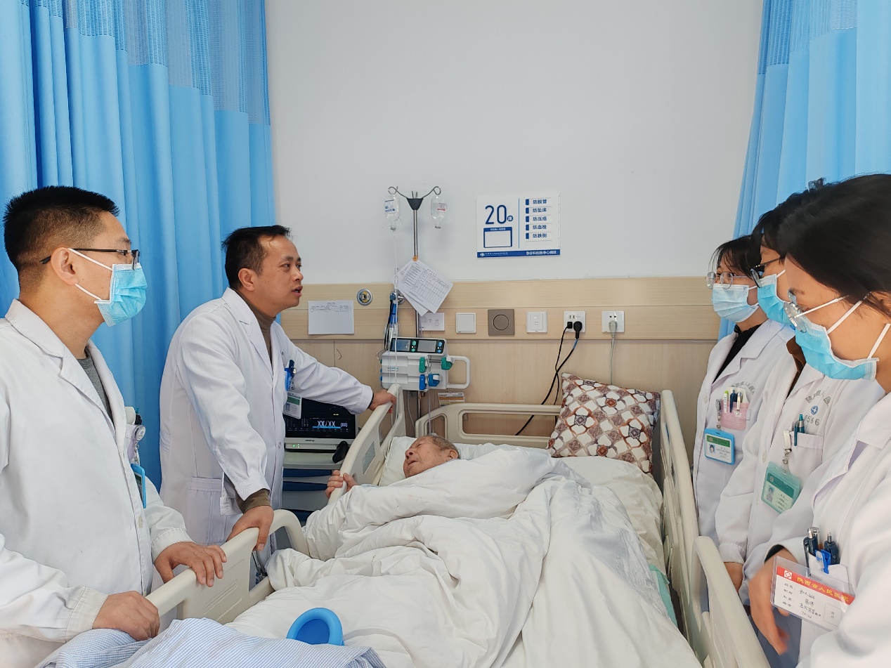 西咸院区急诊医学中心抢救室,患者低血压,氧合指数低,病情十分凶险,接诊医师宋延斌主治大夫紧急启动绿色通道,全面评估病情,采取紧急救治措施,在呼吸机保护下急行肺动脉CTA检查,提示双侧肺动脉主干栓塞。患者高龄,既往有心脏病史,需紧急开通血管,溶栓的出血风险较高,病情危急。急诊医学中心唐龙副主任医师迅速启动院内多学科联动抢救流程,与EICU朱江勃副主任医师、介入科陈思攀副主任全面评估病情、讨论治疗方案后,急诊为患者实施了下腔静脉滤器植入术加肺动脉造影溶栓术,术后转入EICU,经抗凝、溶栓、抗感染等治疗后病情稳定转入普通病房,唐龙副主任医师、主管医生延华副主任医师、聂建住院医师为患者制定了精细的抗凝、抗感染、营养支持方案,护理团队的精心护理、患者顺利出院。