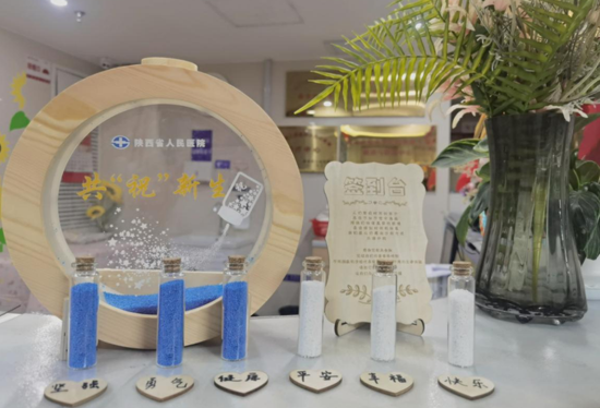 第二项是“流沙共注”环节。家属医护参与将一瓶瓶代表健康、幸福、平安、快乐、勇敢、坚强流沙共同注入圆形的流沙纪念框里,寓意“医患携手一家亲”“共同愿望必实现”。