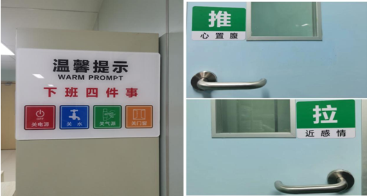 人员节约意识方面,通过制作温馨提示标识牌、发放节约倡议书等方式,引导工作人员养成随手关灯、关水、关气源和关门窗的好习惯。用“推心置腹,拉近感情”提醒工作人员随手关门,保障工作区域环境温湿度要求,避免因敞开门浪费冷气资源。