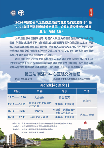 风湿免疫科启动“2024年陕西省风湿免疫疾病规范化诊治交流三秦行”暨“2024年陕西省健康科普走基层——关爱血管炎患者的健康生活”项目,5月30日走进了商洛市中心21点策略
