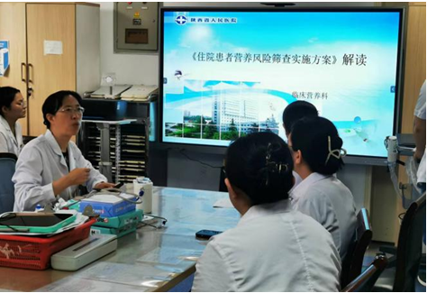 制定《住院患者营养风险筛查实施方案》,持续加强营养诊疗质量安全管理与医务人员培训,进一步提高临床医务人员营养风险筛查意识和能力。7月11日上午,应心内三科姜馨主任邀请,临床营养科张英主任走进心内三科开展了以“《住院患者营养风险筛查实施方案》解读”为主题的培训讲座,心内三科全体医务人员参加。