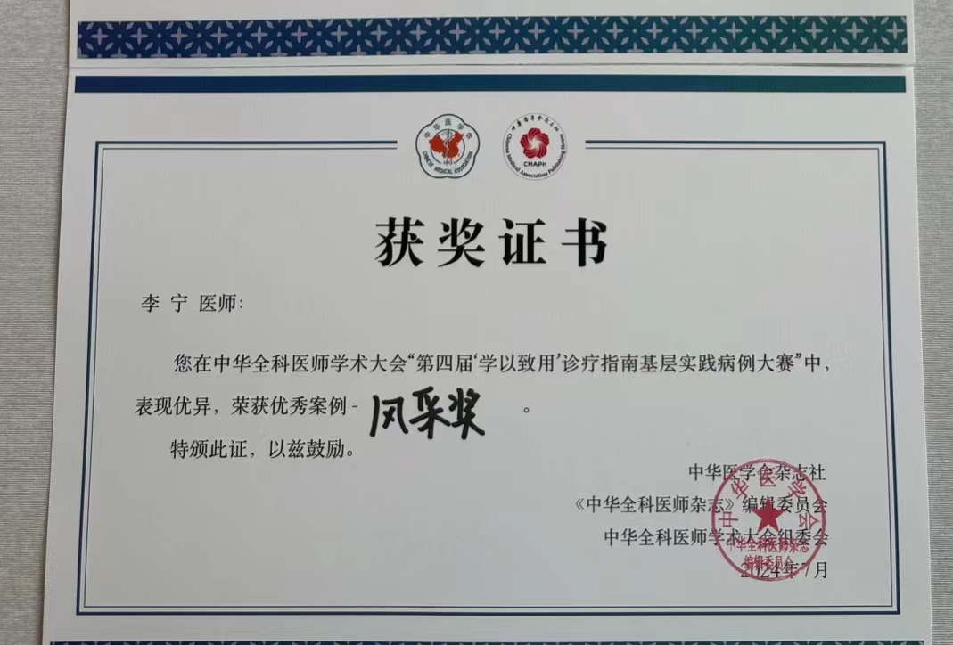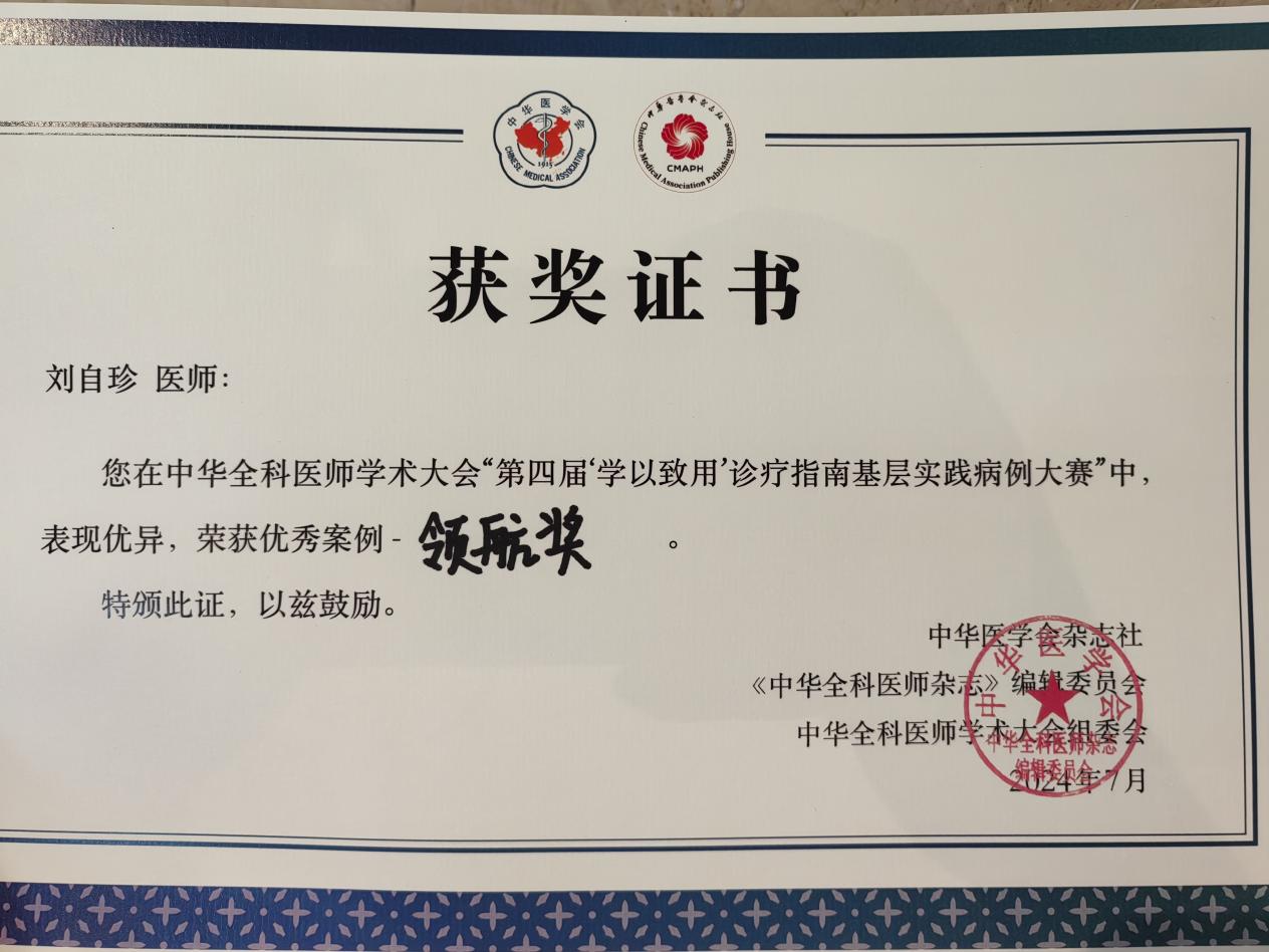 全科医学科两名参赛医生均进入决赛。其中,刘自珍医师的《腹痛隔肚皮,难解其中谜——1例慢性腹痛患者的诊疗与全程管理体会》病史资料详实、病例分析全面、诊疗思路清晰、语言生动流畅、紧扣指南规范,最终以总分第一名获得优秀案例“领航奖”,并在大会基层指南践行案例评析会场上进行了报告。青年医生李宁的《都是“先入为主”惹的祸——1例被异丙嗪误诊的前庭神经炎患者的诊疗体会》荣获优秀案例“风采奖”。