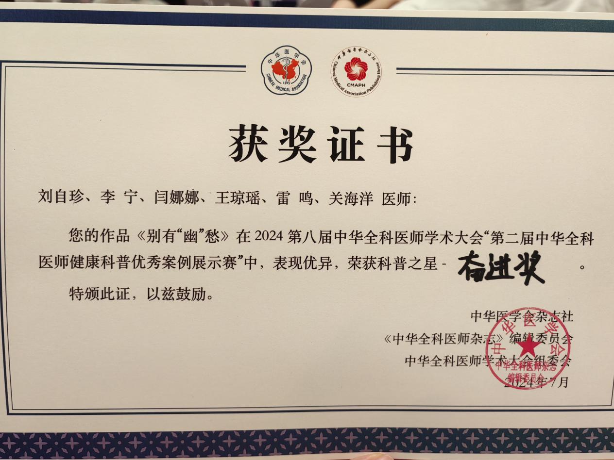 在第二届“中华全科健康科普优秀案例展示赛”中,由刘自珍、李宁、闫娜娜、王琼瑶、雷鸣医生以及二年级规培医生关海洋组成的团队的科普作品《别有“幽”愁》荣获“科普之星-奋进奖”。大赛共收到参赛作品175份,通过视频参赛、线上筛选的形式进行初选,最终全国各医疗卫生机构的49支健康科普团队进入决赛。决赛现场,21点技巧中心