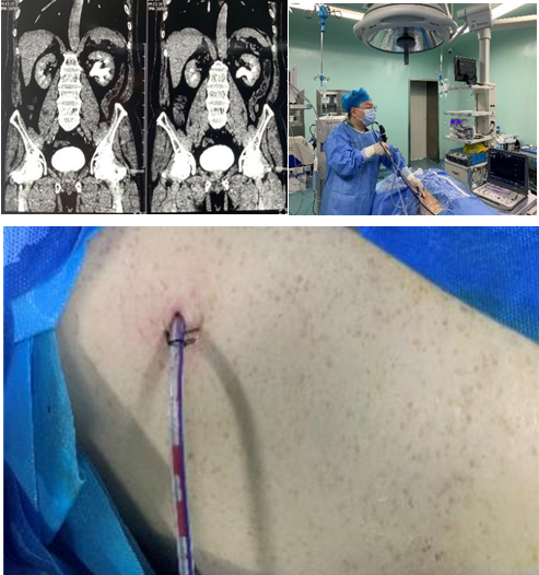 65岁男性病例,因发现左肾巨大结石并肾积水就诊,入院检查双肾CT提示左肾巨大铸型结石,帖鹏副主任医师综合评估患者状况,取得患者及家属同意后,积极术前准备,于全麻下行俯卧位B超定位下左侧肾结石经皮肾镜碎石取石术。在B超引导下采取平面内进针法穿刺,穿刺成功置入F18(微通道)号经皮肾鞘,利用钬激光碎石,术野清晰,手术过程顺利,术中出血少,碎石结束后超声观察肾内几乎无残留结石。