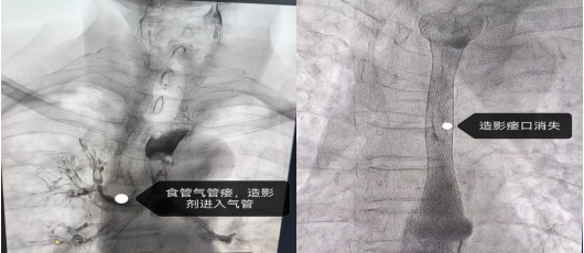 胸外肿瘤科医师团队配合完成,手术过程顺利,术后患者饮食无呛咳症状,造影复查显示水及食物均经食管顺利通过,未见外溢漏出,恢复良好,手术效果明显。