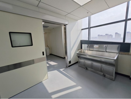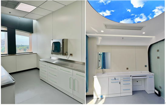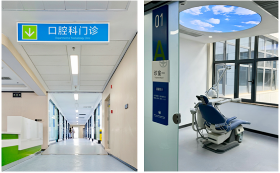 西咸院区口腔科此次升级改造区域面积约570平方米,优化了手术室布局和洗消流程,使功能分区更加合理。特别增设了示教室,为医护人员提供了学习与交流的平台。改造后的口腔科材质和色彩方面以温馨舒适为主,整体选用了浅色的色调。将原有的开放诊室增设磨砂玻璃隔断,既保证了诊室的通透性,又能保护患者就诊的私密性,让患者在就诊过程中感受到更多的尊重与安心。吊顶材料选用了软膜天花,以蓝天白云为背景,暗藏灯带和筒灯,增加诊室的明亮度,缓解患者的紧张情绪,为患者打造轻松愉悦的诊疗环境,提高患者满意度。