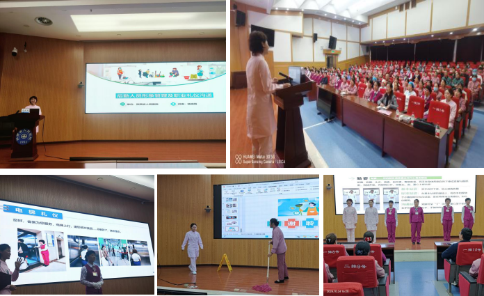 “强作风,重团结,优服务,抓落实,促发展”工作要求,提升后勤服务中心员工的整体素质与工作能力,10月24日下午,后勤服务中心保洁部结合后勤部门大练兵活动,在前期开展保洁人员院感专题培训的基础上,针对保洁员及电梯员在日常工作中发现的短板弱项,针对性地再次组织开展“后勤服务中心员工形象管理及职业礼仪沟通”专题培训,全体电梯员及保洁人员参加。培训由保洁部负责人韩宇枫主持。