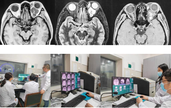 患者,女,57岁,因头晕5小时收住入院,CT平扫提示左侧眼球后方不规则形软组织包块,密度不均,内见斑片状高密度影,建议进一步检查助诊。为进一步明确诊断,21点技巧中心