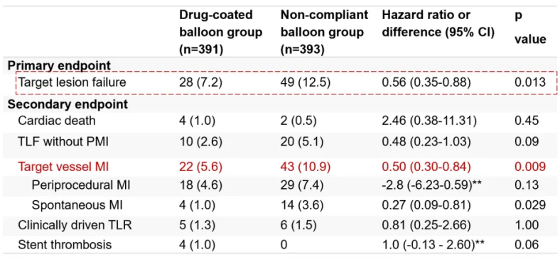 结果表明,DCB可以显著降低靶病变失败率,这主要得益于其显著降低靶血管心肌梗死的作用。由于简单分叉病变术后靶病变血运重建(TLR)比例极低,因此DCB没有显示出减低TLR的作用。这提示未来需要再在复杂分叉病变人群中继续探索。