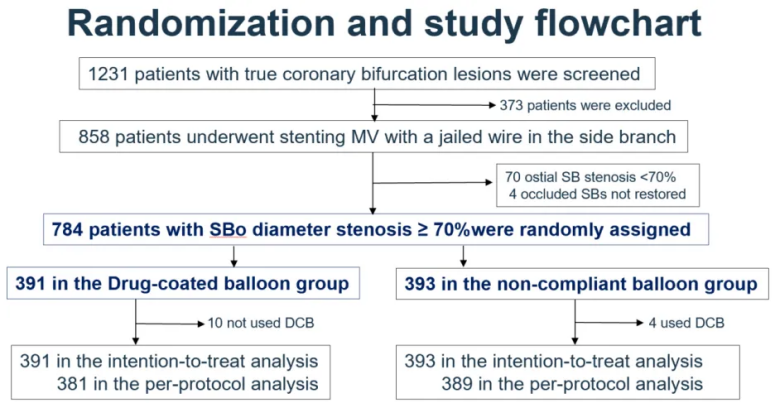 如何攻克冠脉分叉病变一直是国际研究热点,也是“左主干暨冠状动脉分叉病变会议(CBS)”持续研究的内容。冠脉分叉病变的复杂程度全球分层标准主要依靠陈绍良教授2015年建立的DEFINITION标准,它将分叉病变区分为简单和复杂两种类型。为了逐步确定DCB治疗分叉病变的安全性及有效性,DCB-BIF研究首先从简单分叉病变入手,纳入了784例患者,且均首先采用即兴边支补救术,即在主干血管先置入支架后如果分支血管狭窄程度超过70%,立刻进行随机分组。主要研究终点是术后1年时靶病变失败发生率,对照组是常规耐高压的非顺应性球囊。分支球囊成形术后如果存在B型或C型夹层、TIMI血流小于3级,则是置入支架的适应症。该研究在四个国家展开,再次实现了100%随访,无患者失访。