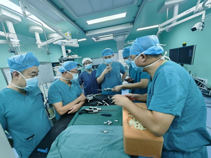 此例手术借助的机器人导航系统由控制系统、定位导航系统、机械臂装置和工具集四大模块组成,四大模块各司其职,环环相扣,共同构建起了一个数字化、智能化、精准化、可控化的手术操作平台。该系统应用广泛,可针对脊柱、关节以及创伤手术进行精准导航,从术前规划、手术通道到图像采集与处理,再到术中定位与导航,以及术者直接干预手术视野,每一个细节都彰显着数字化与精准化的力量。为使得科室医师更加熟练地掌握手术机器人导航系统,骨科前期进行了一系列规范化的操作培训,全面、深入地学习了机器人导航系统的整体构造。青年医生、进修医生以及规培医生以分小组的形式,以3D打印的人体脊柱模型为模拟标本,多次进行模拟演练,掌握了机器人导航系统的使用要求及技术要点。