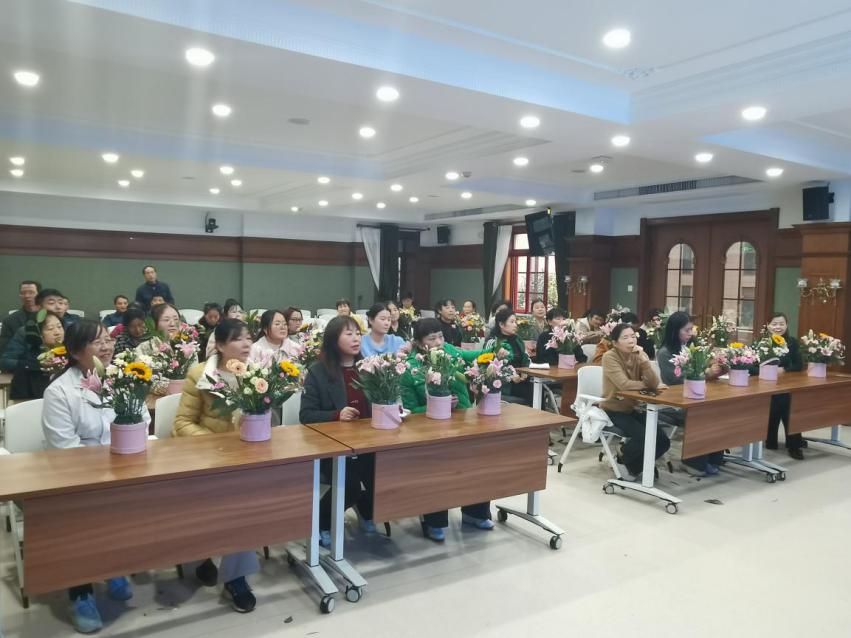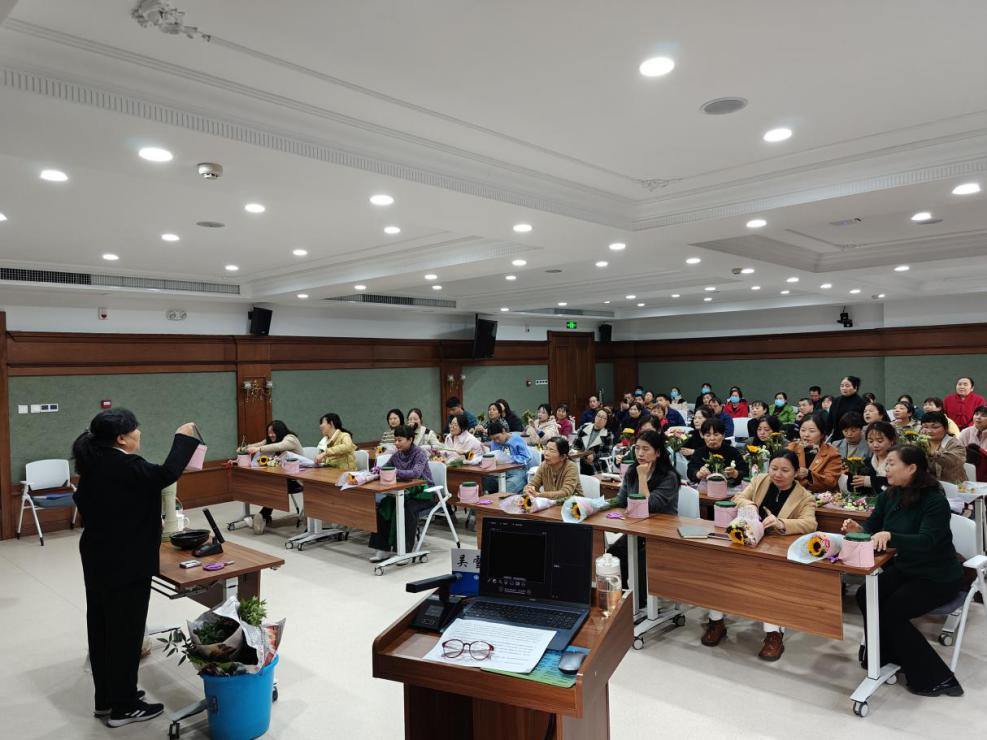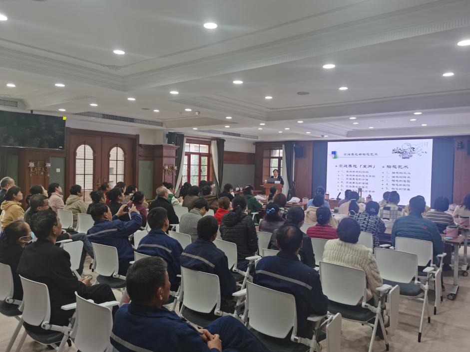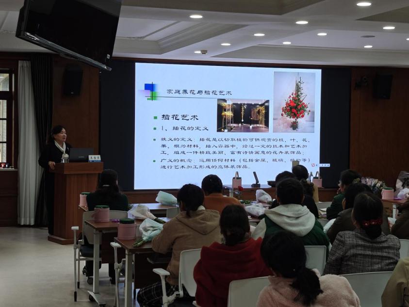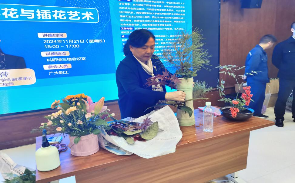 职工美学素养,丰富职工的文化生活,落实“双心”文化,11 月 21 日下午,后勤服务中心举办“家庭养花与插花艺术”讲座,广大职工踊跃参加。讲座邀请到在风景园林和插花艺术方面有着深厚造诣的陕西省风景园林学会副理事长、正高级工程师专家吴雪萍授课,由后勤服务中心郝朋主持。