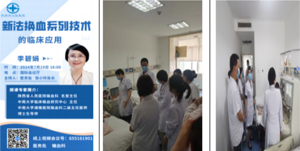顺利落地实施,首次成功治疗了4例患者。为进一步实施推广,输血科名誉主任李碧娟教授在全院范围内进行了“新法换血系列技术临床应用”培训以及现场查房指导,使更多医护人员了解和掌握了这些先进的血液治疗技术。同时,医务处联合输血科还特别组织了“半全血置换技术与神经免疫疾病”的专题研讨会,进一步探讨了该项技术在神经免疫疾病治疗中的应用和前景。