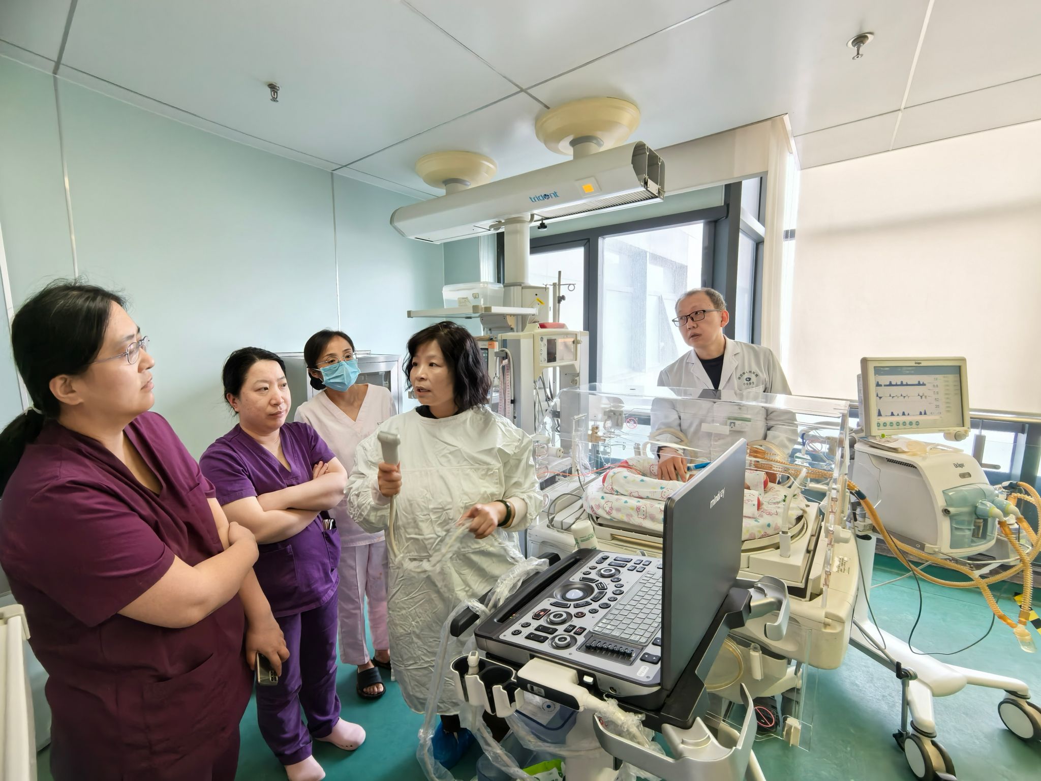 NICU,针对一例胎龄28+1周合并hsPDA的极低出生体重儿,现场演示了床旁即时肺部超声联合心功能及靶器官血流监测快速综合评估有创通气下循环支持决策的全流程,为后续“早产儿呼吸管理学习班”专题讨论提供了实际案例。