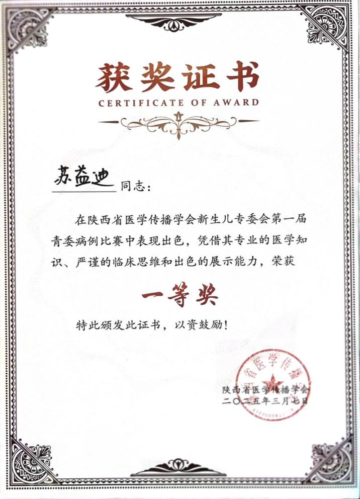 新生儿科青年医师苏益迪在此次大赛中脱颖而出,荣获一等奖。
