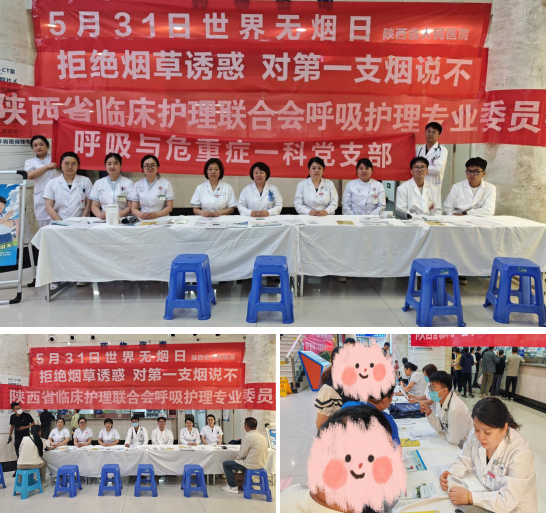 2025年5月31日是第38个世界无烟日。为贯彻落实《“健康西安2030”行动规划》和《西安市人民政府关于推进健康西安行动的实施方案》精神,普及烟草危害知识,积极营造有利于青少年健康成长的良好无烟环境,围绕“拒绝烟草诱惑,对第一支烟说不”的主题,公共卫生科、呼吸与危重症一科、陕西省临床护理联合会预防保健专委会、陕西省临床护理联合会呼吸护理专委会联合,组织开展了内容丰富的控烟义诊宣传活动。