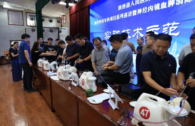 对脑出血等危急重症的救治能力,推广神经内镜血肿清除技术的标准化操作流程。来自渭南地区七个县区的神经外科骨干医师参加了培训。